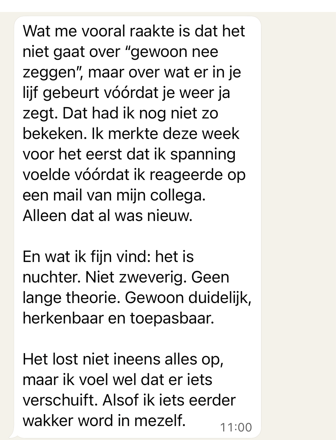 Het is niet zo dat ik nu ineens overal nee tegen zeg. Dat verwachtte ik ergens misschien wel stiekem. Maar wat er wel veranderd is, is dat ik eerder voel wanneer iets schuurt. En dat ik soms (niet altijd) even pauze neem. Dat alleen al geeft meer rust. Alsof ik niet meer helemaal overgeleverd ben aan mijn automatische reactie.