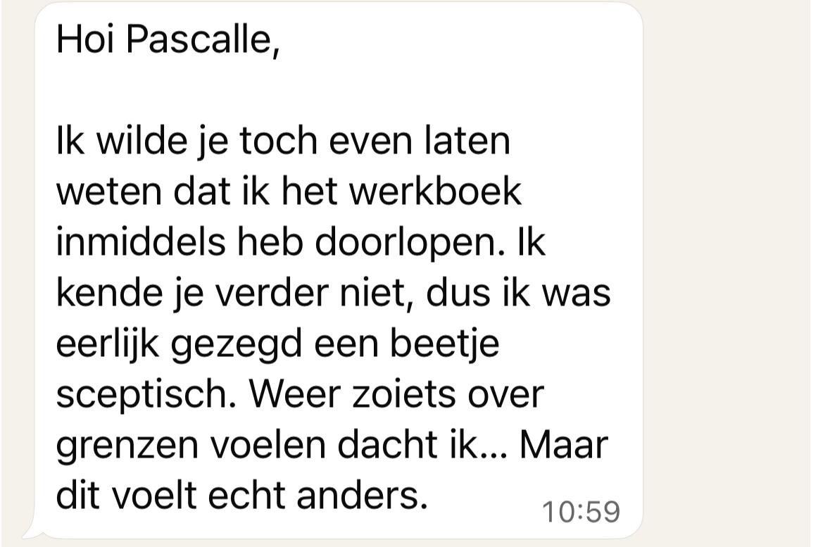 Wat me het meest raakte, is dat ik eindelijk snap waarom ik steeds over mijn grens ga. Niet omdat ik zwak ben, maar omdat mijn lichaam sneller reageert dan mijn hoofd. Alleen dat inzicht gaf al zoveel rust. En het anker uit het werkboek gebruik ik bijna dagelijks.