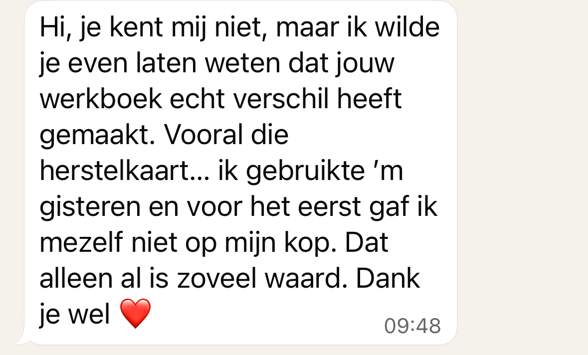 Wat ik ook fijn vond, is dat het heel praktisch en duidelijk is en tegelijk verdiepend. De voorbeelden van anderen waren zó herkenbaar dat ik regelmatig dacht: dit ben ik. En de herstelkaart heb ik al een paar keer gebruikt, vooral op dagen dat ik toch weer in mijn oude patroon schoot. In plaats van mezelf af te branden, kon ik gewoon opnieuw beginnen.